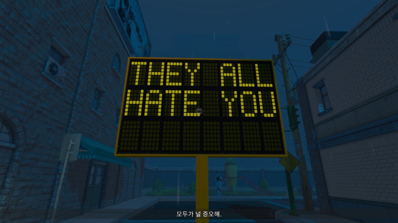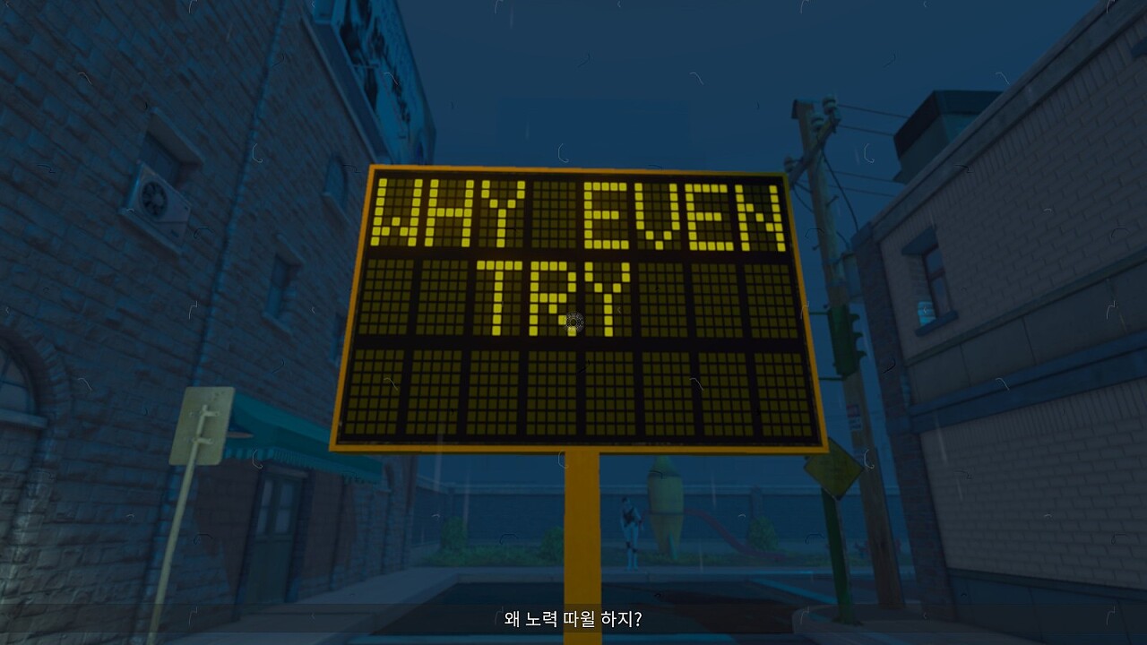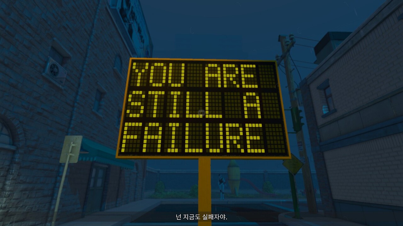 마약으로 인해 배경의 분위기가 바뀌었지만 여전히 플레이어(혹은 의뢰인)을 비난하는 간판 속의 메시지.