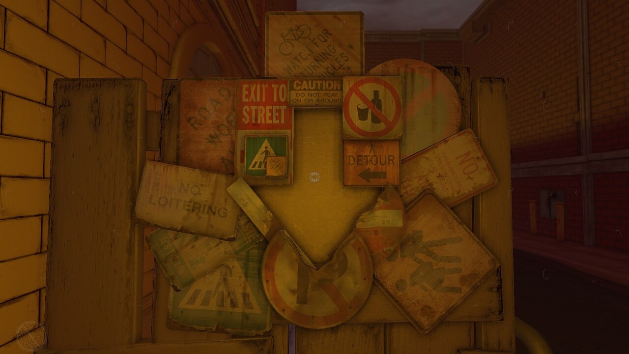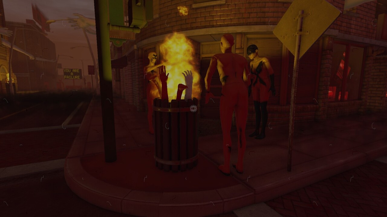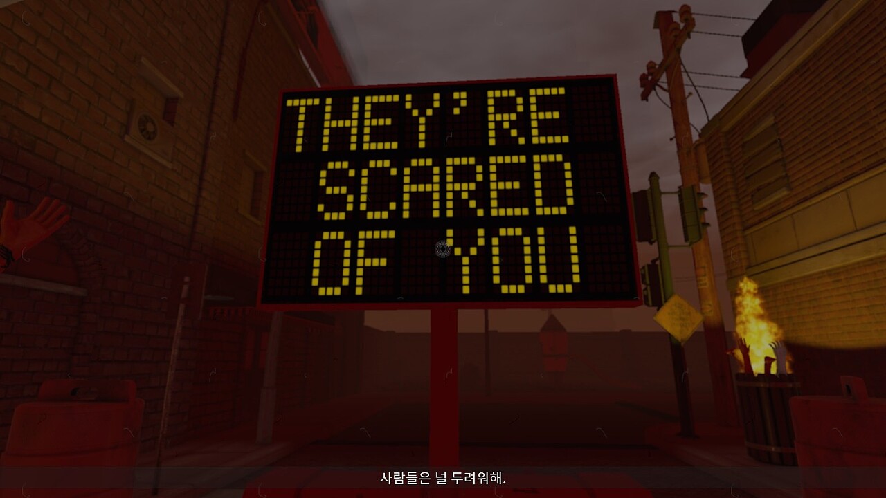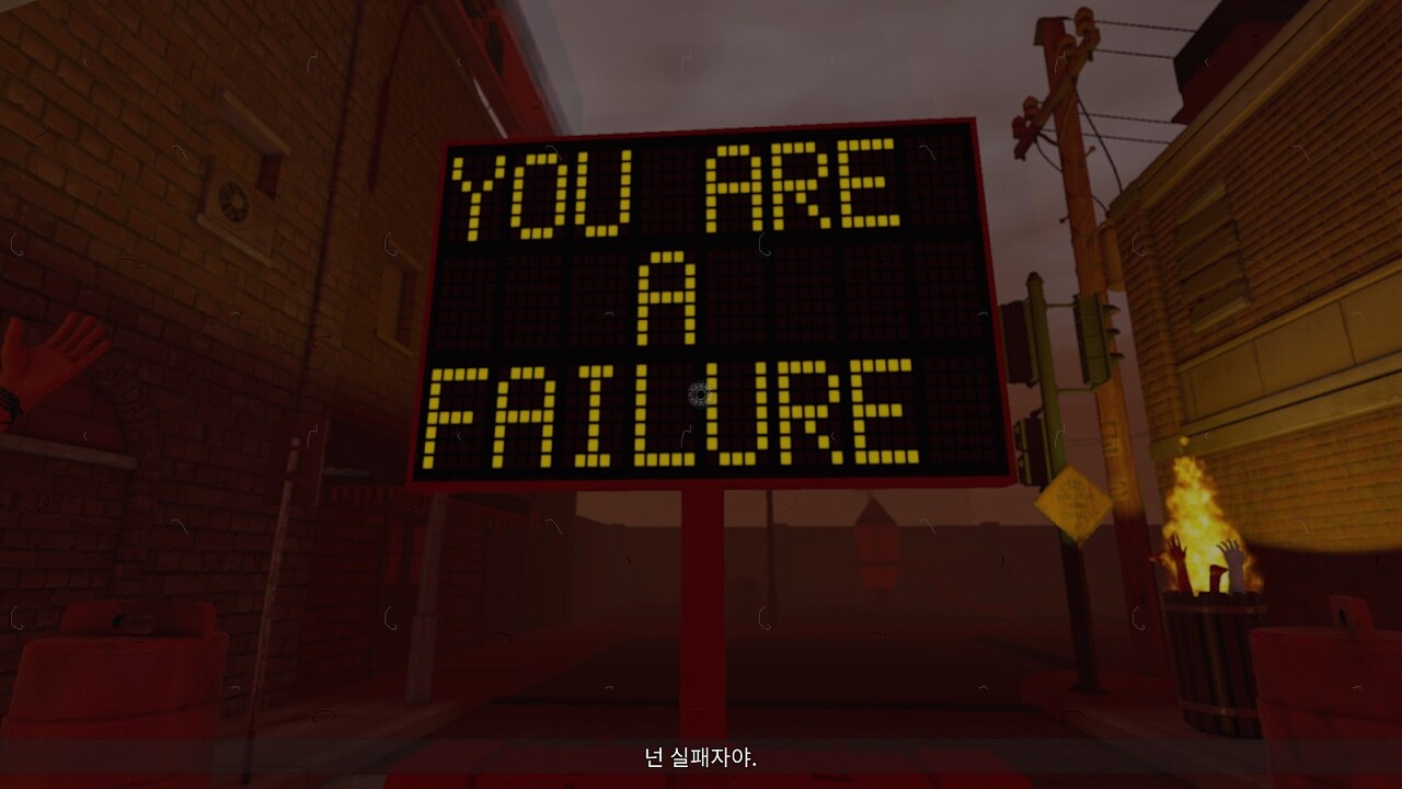 마약으로 인해 배경의 분위기가 바뀌었지만 여전히 플레이어(혹은 의뢰인)을 비난하는 간판 속의 메시지.