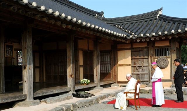 충남 당진에 위치한 솔뫼성지의 김대건 신부 생가. 프란치스코 교황이 방문하여 헌화와 함께 기도를 올리고 있는 모습.