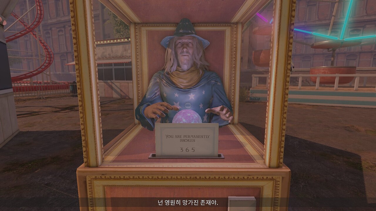 플레이어가 롤러코스터에 접근하자, 탑승자들의 비명 소리가 점점 커지더니 화면에 핏자국이 맺힙니다.